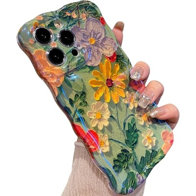 IPhone 13 Pro Max phone case, color retro oil painting print flower laser glossy pattern cute curled wave edge exquisite